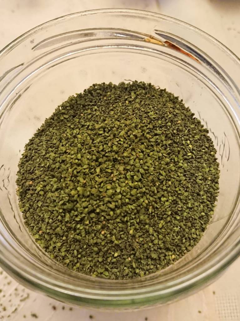 The seeds are ready to harvest when their green clusters (not brown) droop downwards, heavy on their stems rather than sticking up or outright whilst they are still growing. Nettle seeds can be eaten fresh (but watch out as the thread they hang on stings a little unless crushed) or dry and can be sprinkled on near enough anything, from smoothies, cereal, salads and soups.