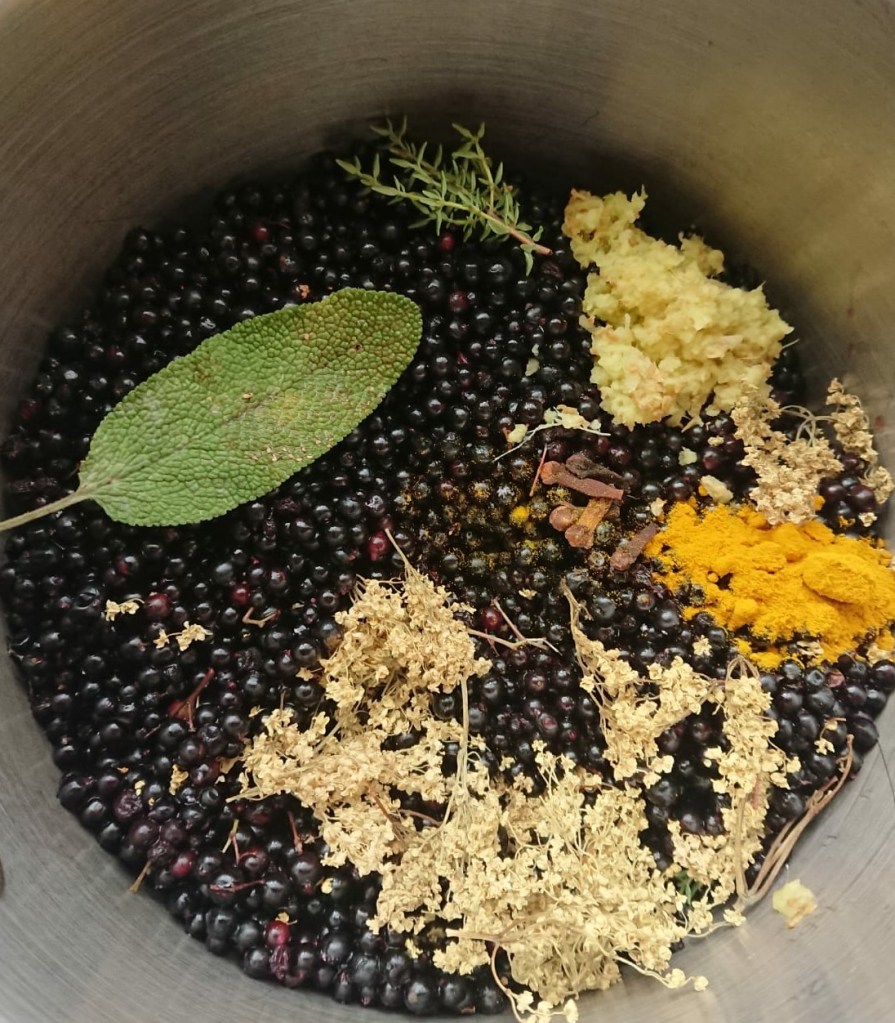Our first oxymel of the year was made with some very early but ripe foraged elderberries. They are packed full of vitamin C and have a wealth of properties that support the immune system, helping ease coughs throughout the winter months. We also teamed our elderberries with anti-viral herbs and spices, including fresh thyme, sage, grated ginger and dried elderflowers, tumeric and cloves, but these could be substituted for what herbs and spices you have available. You could also include other berries too such as blackberries or sloe berries.