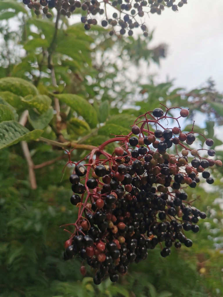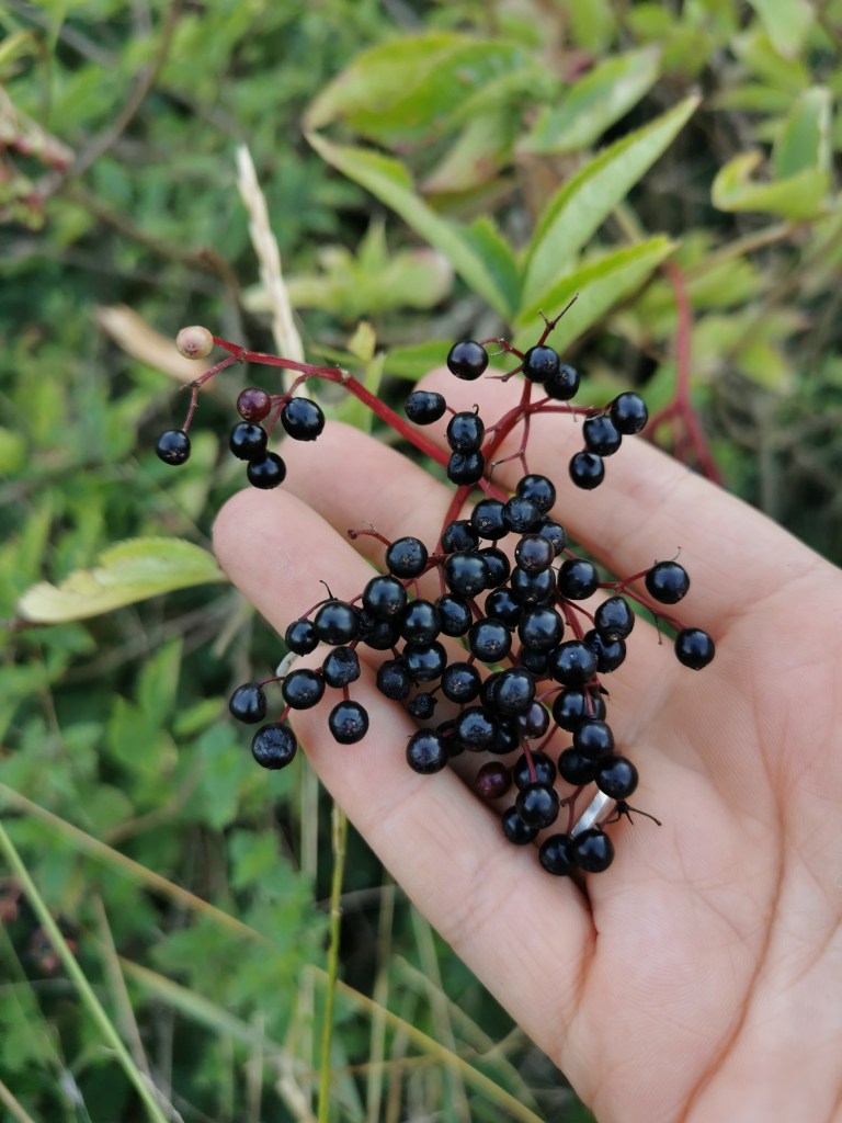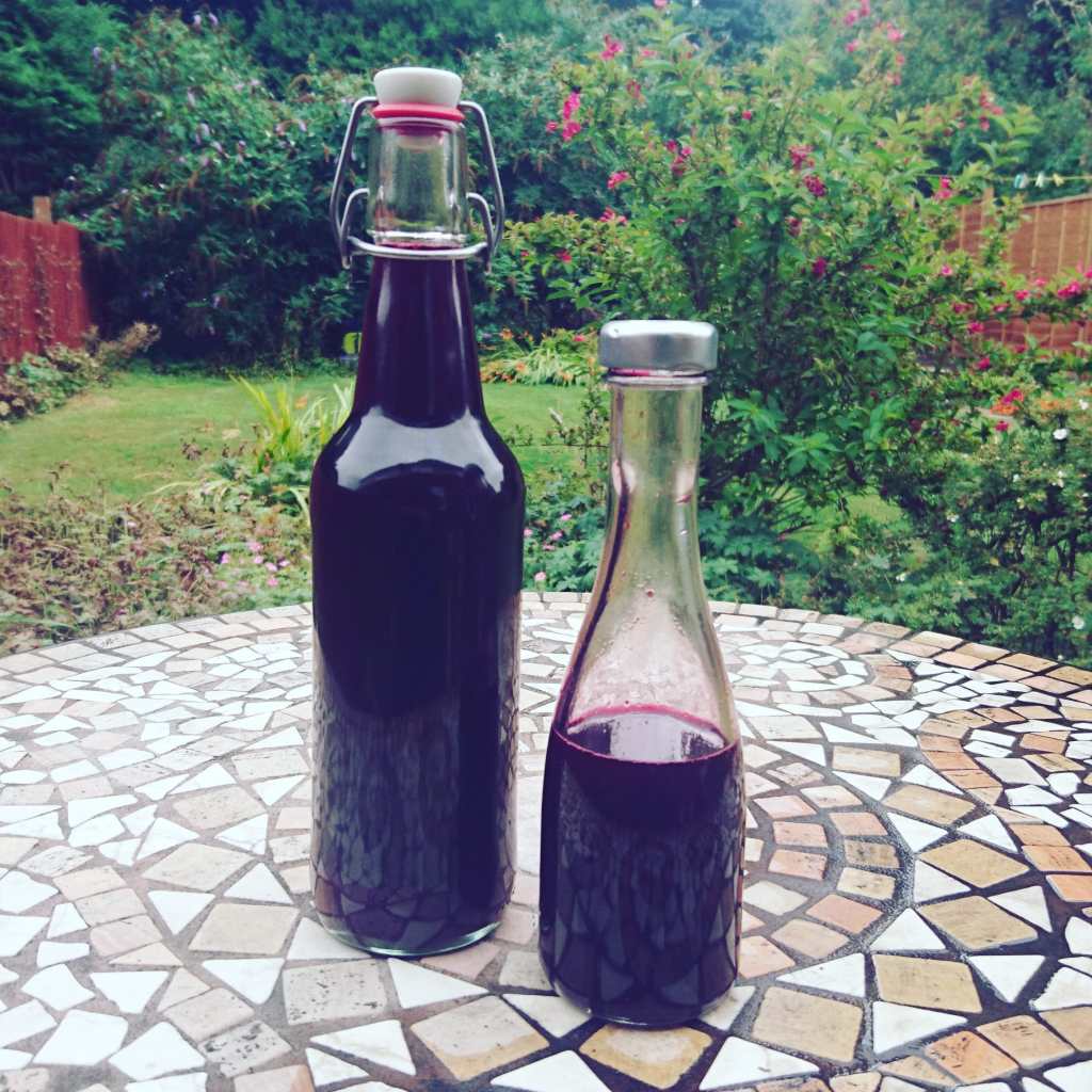 Elderberries shouldn’t be eaten raw so we simmered about 3 cups of elderberries (first removed from their stalks with a fork) with half a cup of water and our herbs and spices to gently to release the juice from the berries. After around 10 minutes we strained the juice through a sieve, ensuring that we pressed all of the pulp to get as much juice as possible out of the berries, before allowing it to cool. We then mixed 1 part juice with roughly 1 part raw apple cider vinegar and 1 part raw honey poured into a sterilised bottle, labelled and popped into the fridge. The ratio of honey can be adjusted if you would prefer a sweeter taste.