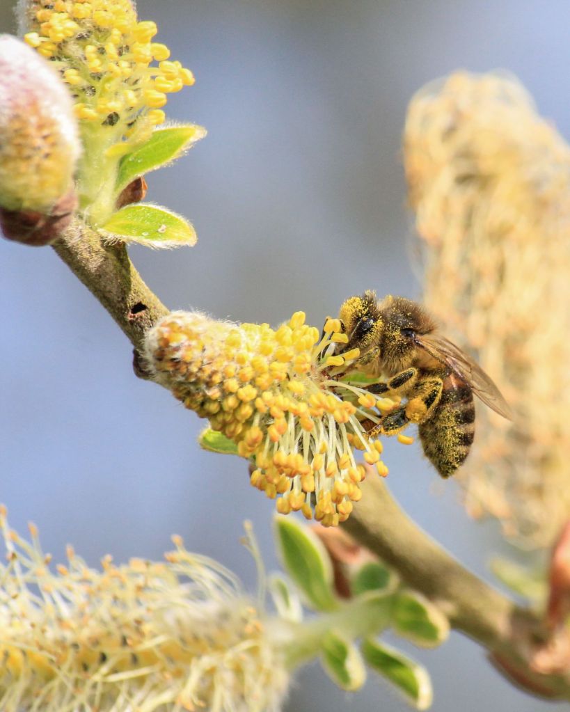 The trees are dioecious meaning they grow male and female flowers on separate trees. The striking ‘Pussy Willow’ catkins open into beautiful yellow male flowers of Goat or Grey Willows (these species are very similar and often hybridise so can be difficult to tell apart). The female flowers develop on different trees along with the leaves later in the Spring. Both the flowers and leaves are very important nectar and food source for many insects throughout the year.