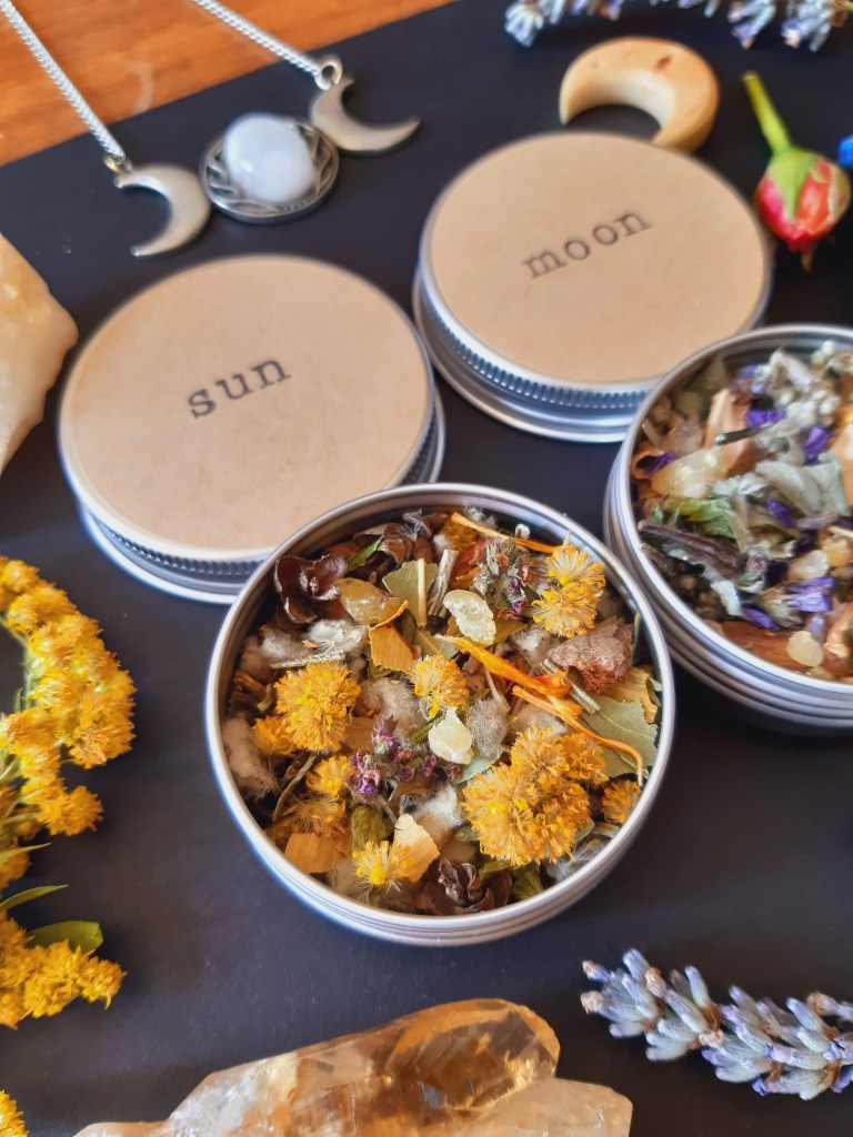 A warming blend of plants associated with the sun and the fire element, crafted during Summer’s peak at Lammas.