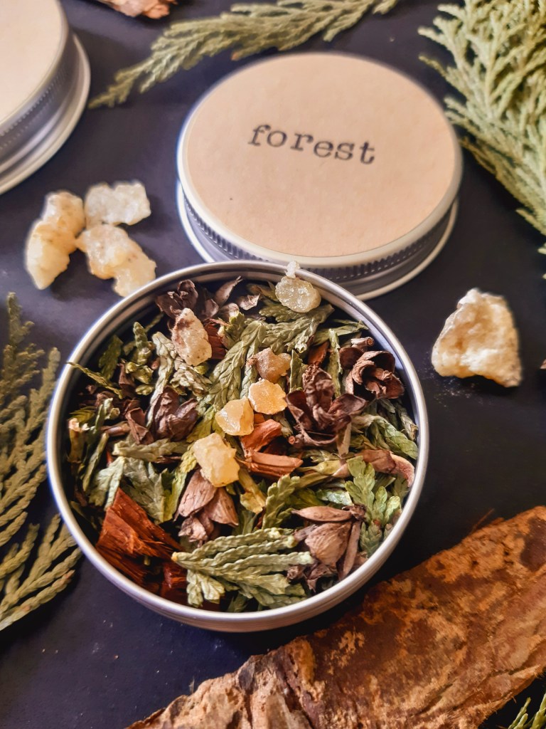 This blend celebrates the magickal and uplifting aromas of an evergreen forest. With leaf, bark, cones and resin gathered slowly and ethically from windfallen Pine, Cedar and Fir trees.