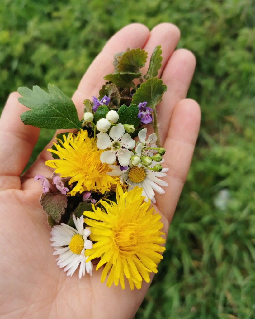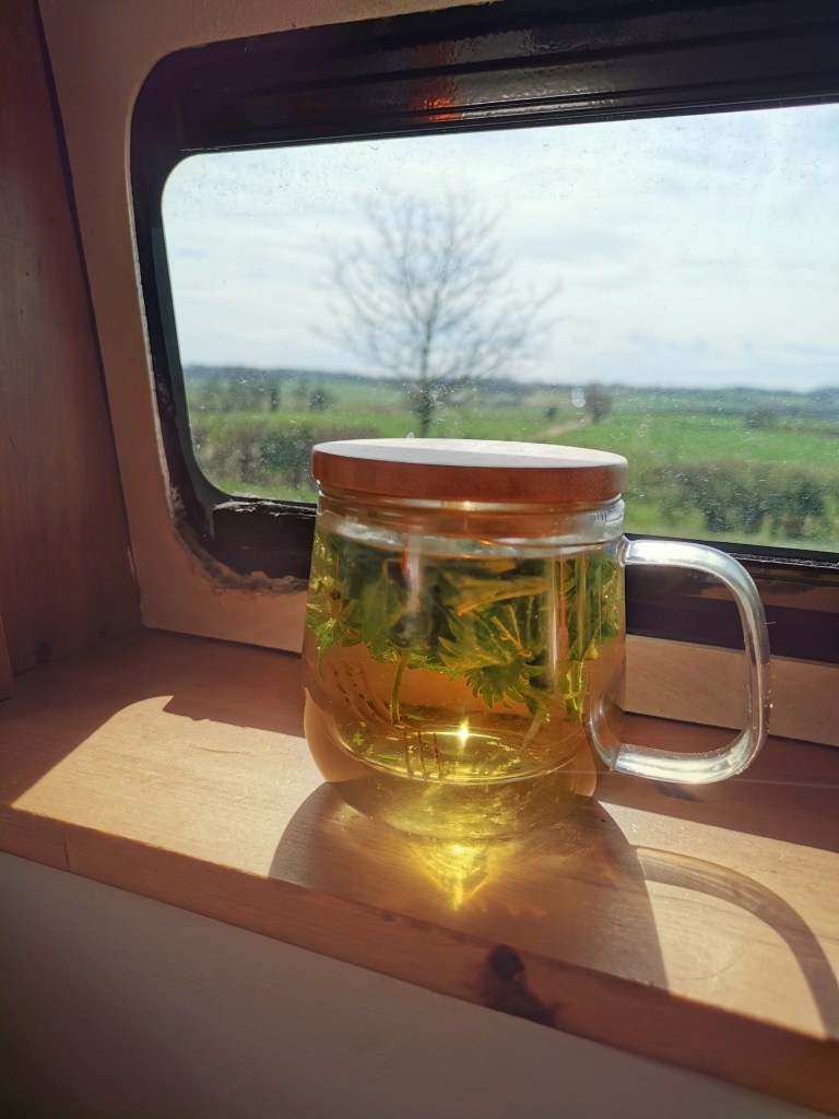 Some of my favourites just now are: Dandelions, (flowers & leaves) Daisies, Nettle, Cleavers, Red dead Nettle, Hawthorn, (leaves & flowers) and Ground Ivy amongst many others. If you don’t feel confident identifying wild plants just yet, fresh herbs can be a wonderful addition to your cup too. Lemon balm, Mint, Sage and Rosemary are all growing well now.