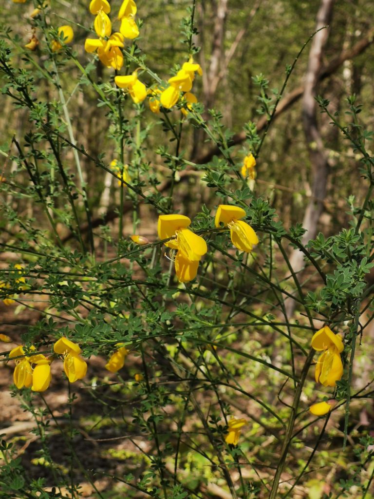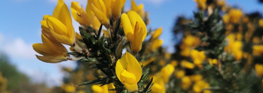 The key ways to tell them apart is that Gorse has sharp spikes (pictured above) and its flowers have a strong coconut like scent, whereas Broom (pictured below) has neither of these characteristics.