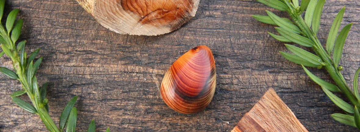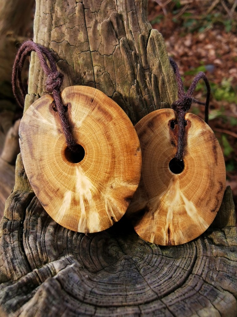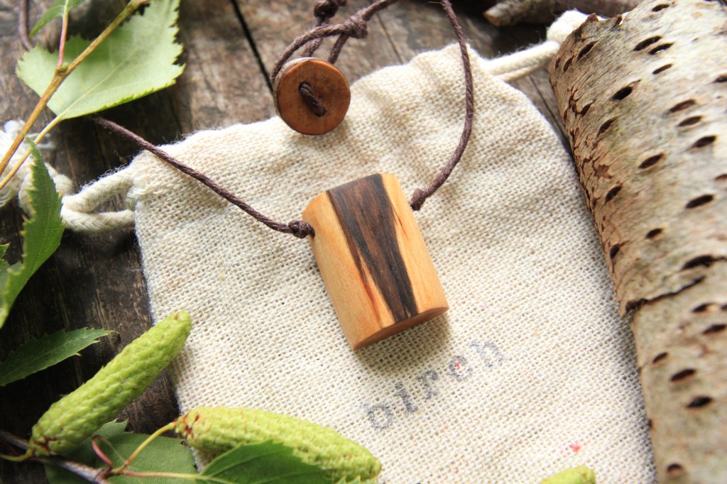 We work intuitively, guided by the wood to highlight the intricacies and life history of each piece. The result is unique wooden jewellery with character, patterns and wonderful colourings. Each piece is finished with organic oil, threaded on hemp cord and fastened with a hand-made birch button ready for its new home.