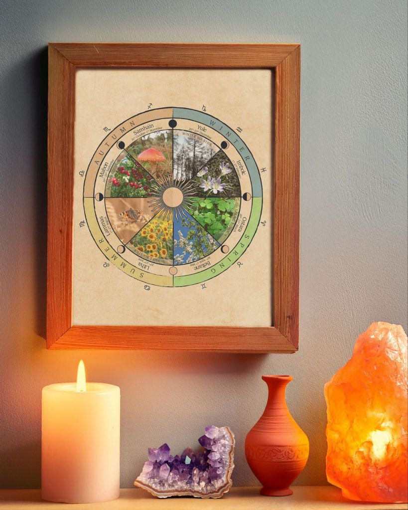 The wheel of the year acknowledges the cyclic movement of the seasons throughout the year. The wheel consists of 4 Solar Festivals ( 2 Solstices and 2 Equinoxes) and 4 Seasonal Festivals (Imbolc, Beltane, Lammas and Samhain).